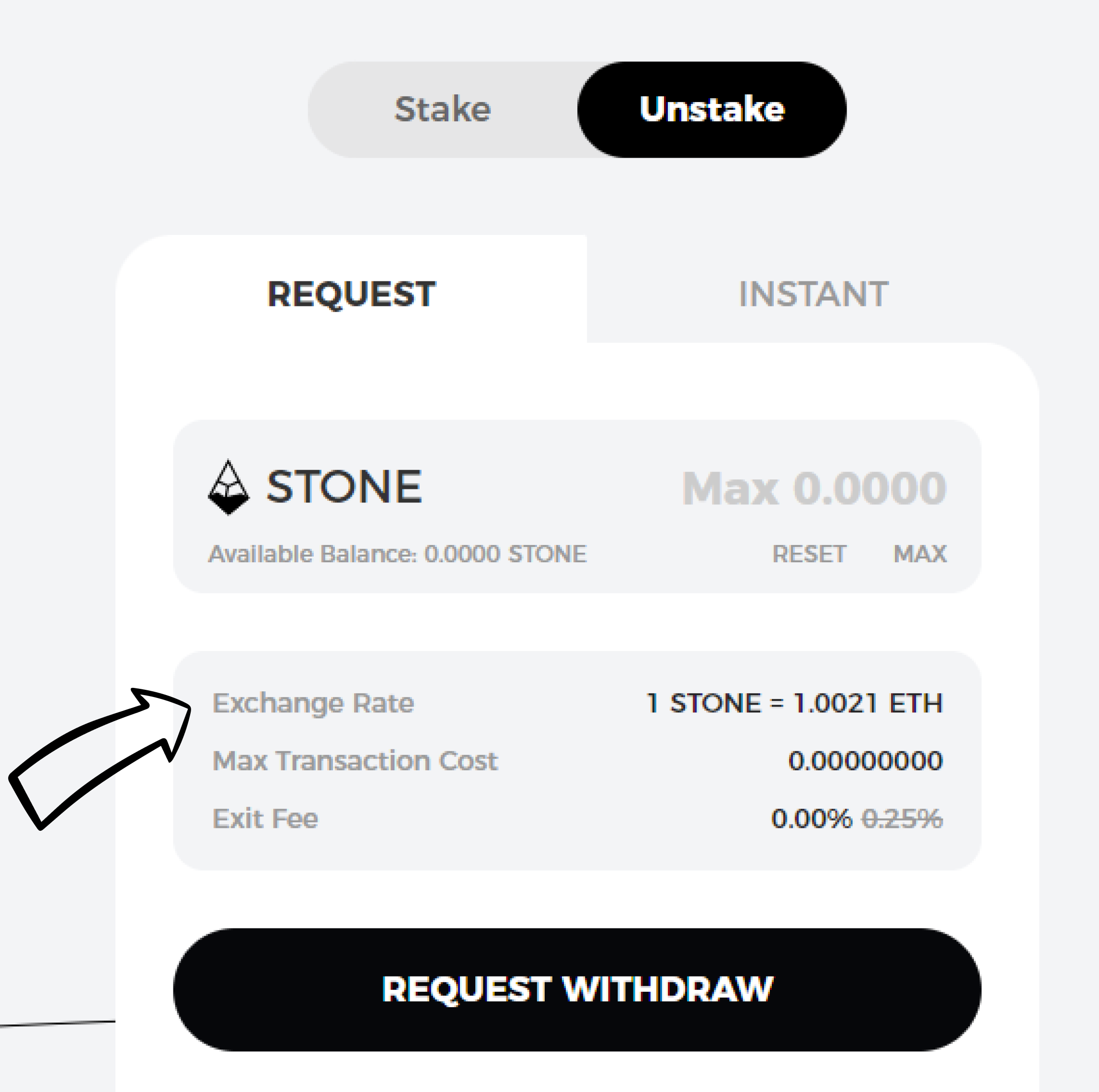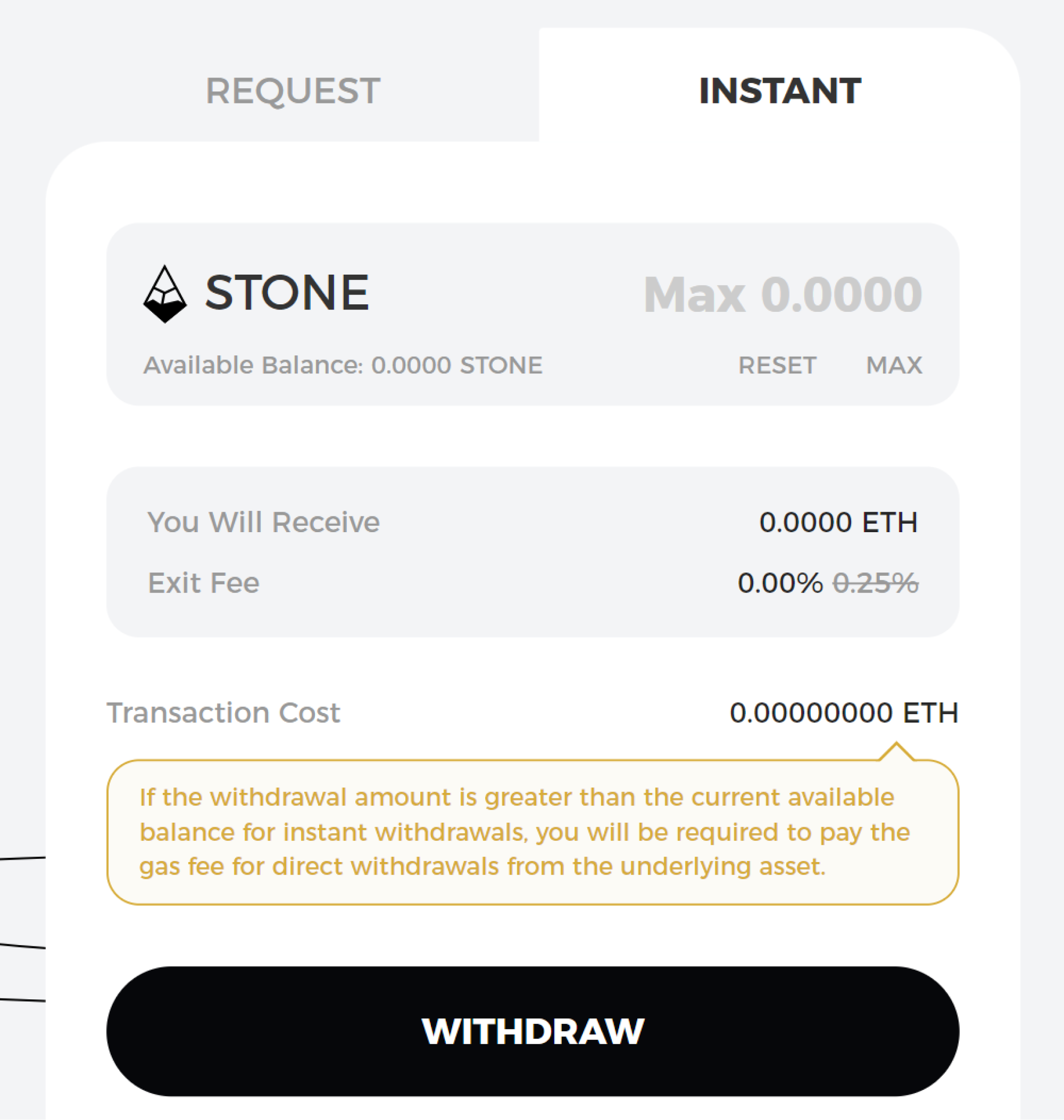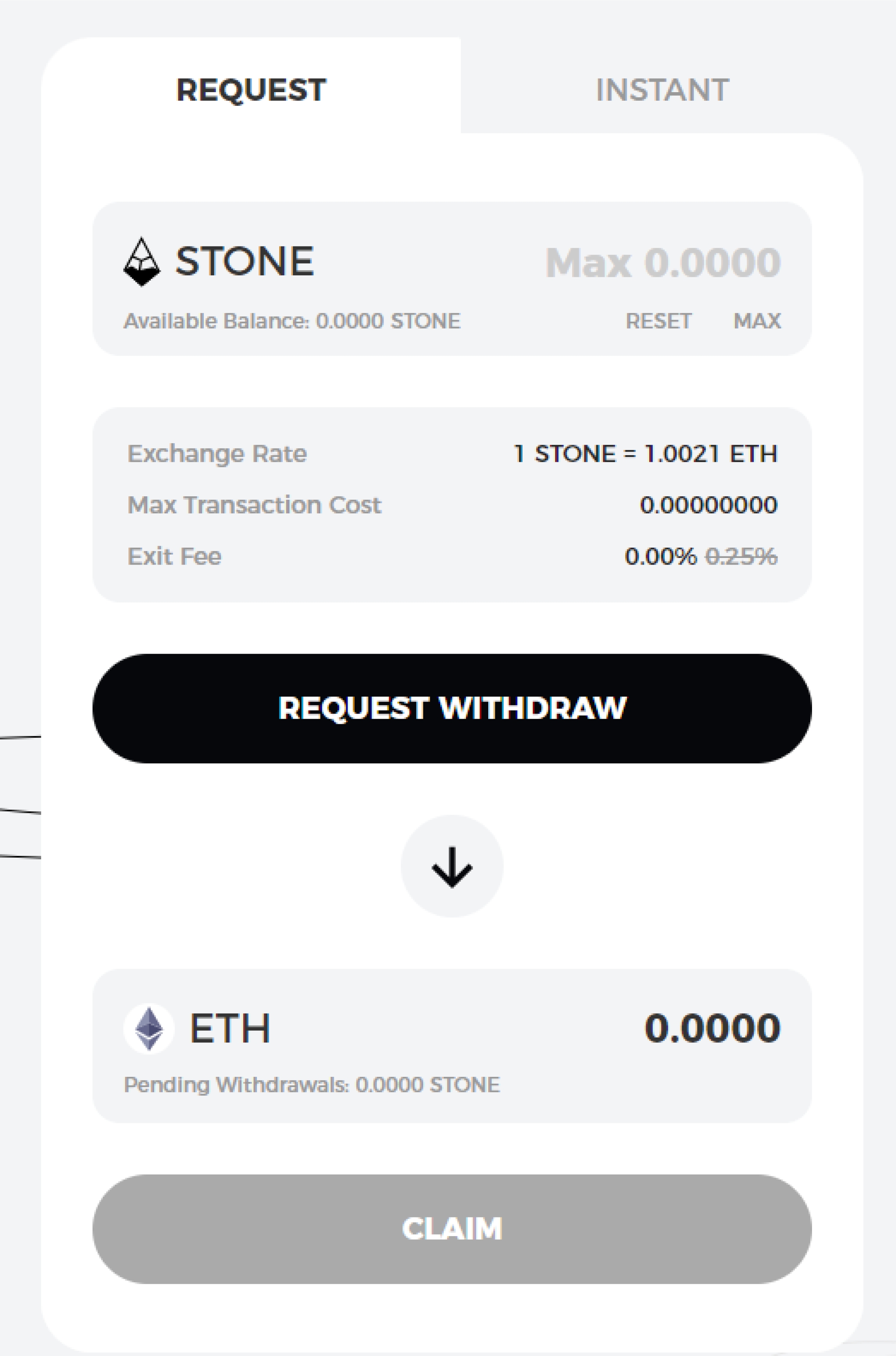 The amount of ETH withdrawn with STONE is determined by the price of STONE in the contract. StakeStone offers two methods for withdrawing/unstaking: [Request] and [Instant]
