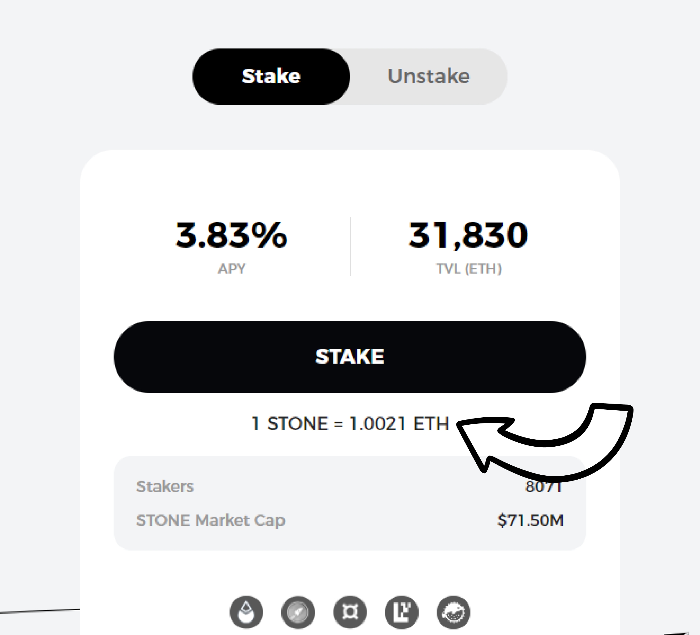 Visit the website: stakestone.io and launch APP, then users can find the price for 1 STONE at this moment. When processing unstake, users can also check the [Exchange Rate] for 1 STONE.